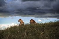 Op een heuvel op de Serengeti genieten leeuwen van het uitzicht.