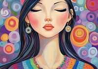 Details: modern schilderij, vrouwenportret, kleurrijk, serene uitstraling, cirkelpatronen, artistieke oorbellen, gesloten ogen, moderne…