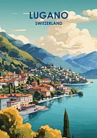 Ontdek de betoverende schoonheid van Lugano, Zwitserland. Dit charmante stadje ligt aan de oevers van een kristalhelder meer en biedt een adembenemend uitzicht op de Zwitserse Alpen. Onze poster vangt de idyllische sfeer met zijn kleurrijke gebouwen, weelderig groen en serene wateren.