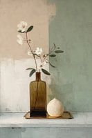 Een contemplatief stilleven waar delicate witte bloemen in een amberklerig glazen flesje rust vinden tegen een subtiel geschilderde achtergrond van beige en groen tinten. Naast een crèmekleurige bol vormt dit arrangement een meditatie op eenvoud, kleur en de schoonheid van het vergankelijke. Het werk ademt een moderne minimalistische…