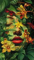 Prachtige vermenging van flora en portret, waarbij het gezicht van een vrouw naadloos opgaat in de weelderige achtergrond van tropische bloemen en bladeren. Het gezicht, centraal in de compositie, wordt gedeeltelijk verborgen door de rijke vegetatie, wat een gevoel van mysterie en eenheid met de natuur suggereert. De kleuren zijn…