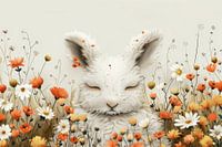 "Sereniteit in Bloemen" vangt een vredig moment van een slapende haas, omringd door een zee van delicate bloemen in warme tinten van oranje, geel en wit. De zachte texturen van de haas' vacht contrasteren prachtig met de gedetailleerde bloemblaadjes die om hem heen dansen, wat een gevoel van rust en harmonie uitstraalt. De subtiele, minimalistische achtergrond benadrukt de puurheid van het tafereel, waardoor de focus volledig op de sereniteit van het slapende dier ligt. Dit kunstwerk is een perfecte keuze voor liefhebbers van natuur en rustgevende interieurdecoratie.