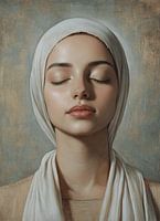 Dit verfijnde portret toont een aantrekkelijke vrouw met haar ogen gesloten, gekleed in een witte hoofddoek en een beige top. Geïnspireerd door de stijl van Dino Valls, is het schilderij uitgevoerd in gedempte kleuren die de kalmte en sereniteit van de vrouw benadrukken. Haar gladde huid en de zachte belichting versterken de rustgevende uitstraling van het portret, terwijl de textuur van de neutrale achtergrond haar gezicht op de voorgrond plaatst. Ze lijkt in diepe meditatie of gebed, haar recht naar achter vallende haar voegt zich naadloos in de serene compositie. Dit werk straalt vrede en introspectie uit, ideaal voor wie op zoek is naar kunst die innerlijke rust weerspiegelt.