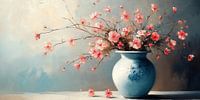 Een sereen stilleven waarin delicate roze kersenbloesems elegant uit een klassieke blauwe vaas ontspringen. Het zachte kleurenpalet van turquoise en roze creëert een harmonieus contrast, terwijl de losse, bijna dansende compositie van de bloesemtakken een gevoel van natuurlijke gratie uitstraalt tegen een dromerige, lichte achtergrond.