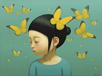 "Serenity in Blue" legt een moment van pure rust vast. Het portretteert een jong meisje in een zacht blauw shirt, met een serene uitdrukking terwijl ze wordt omringd door delicate gele vlinders. Tegen een rustgevende turquoise achtergrond creëert het contrast tussen de levendige vlinders en de kalme tint van haar kleding een harmonieus evenwicht dat een gevoel van vrede en verwondering oproept. De vlinders lijken om haar heen te dansen en symboliseren transformatie en vrijheid, terwijl de algehele compositie een zachte, opbeurende energie uitstraalt. Dit werk is perfect voor mensen die een vleugje rust en schoonheid in hun ruimte willen brengen, als dagelijkse herinnering aan onschuld, vreugde en de stille magie van de natuur.