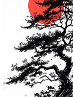 Deze minimalistische muurschildering toont de rustige schoonheid van een Japanse bonsaiboom tegen een felrode zon. Het elegante contrast tussen de zwarte inktachtige takken en de heldere karmozijnrode cirkel roept de traditionele Japanse esthetiek op en symboliseert evenwicht, kracht en harmonie met de natuur. Perfect voor moderne of zen-geïnspireerde interieurs, voegt het een vleugje rust en tijdloze verfijning toe aan elke ruimte.