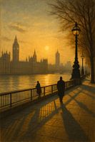 South Bank Serenity legt een gouden Londense schemering vast langs de Theems, waar stilte en majesteit elkaar ontmoeten. Het uitzicht strekt zich uit in de richting van Westminster en de Big Ben, die beide baden in zacht amberkleurig licht terwijl de lage winterzon boven de horizon uitsteekt. Twee eenzame figuren treuzelen bij de reling, hun langgerekte schaduwen smelten samen met het trottoir en roepen een gevoel van kalme introspectie op temidden van de grootsheid van de stad.