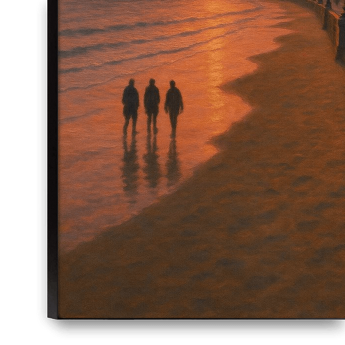 Sunset Promenade Serenity legt de elegante kustlijn van San Sebastián vast, badend in een vurige schemering. De promenade kronkelt zachtjes langs de Baai van La Concha, de lantaarnpalen flikkeren tot leven terwijl de lucht bloeit in tinten van koraal en roos. Drie figuren lopen langzaam over het natte zand, hun schaduwen weerspiegeld in…
