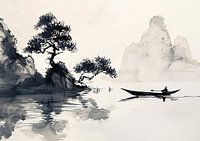 Een traditionele Japanse aquarel met de natuur als centraal thema. Zwarte inkt wordt gebruikt in verschillende concentraties om de essentie en geest van het onderwerp vast te leggen. Het beeld is een sereen landschap met kanalen tussen mangroven, waarbij de wortels van de bomen zichtbaar zijn in het water. Ondertussen vaart een kajak rustig over dit water. Het schilderij is gericht op eenvoud en minimalisme, met zorgvuldig gecontroleerde penseelstreken om de delicate schoonheid van de natuur over te brengen. De lege ruimtes spelen een cruciale rol in de compositie, het straalt een gevoel van balans en rust uit.