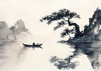 Een traditionele Japanse aquarel met de natuur als centraal thema. Zwarte inkt wordt gebruikt in verschillende concentraties om de essentie en geest van het onderwerp vast te leggen. Het beeld is een sereen landschap met kanalen tussen mangroven, waarbij de wortels van de bomen zichtbaar zijn in het water. Ondertussen vaart een kajak rustig over dit water. Het schilderij is gericht op eenvoud en minimalisme, met zorgvuldig gecontroleerde penseelstreken om de delicate schoonheid van de natuur over te brengen. De lege ruimtes spelen een cruciale rol in de compositie, het straalt een gevoel van balans en rust uit.
