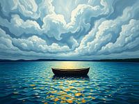 Een eenzame houten roeiboot ligt vredig op een rustig wateroppervlak. Het donkere silhouet contrasteert met de glinsterende gouden reflecties van de zon. Het oppervlak van het water'leeft met zachte rimpelingen, geschilderd in verschillende tinten blauw en geaccentueerd met warm, verstrooid licht. Daarboven ontvouwt zich een…