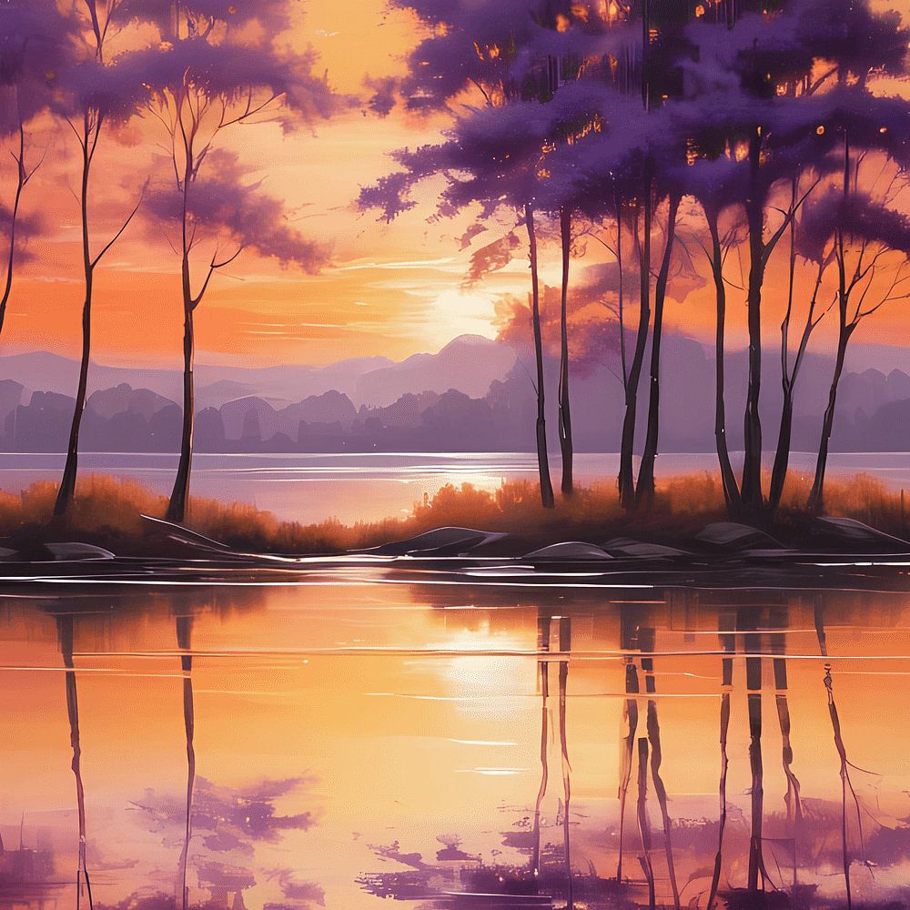 Een sereen en dromerig landschapschilderij vangt de rustige schoonheid van een zonsondergang boven een meer. De scène wordt gedomineerd door paarse en oranje tinten en ademt een vredige en etherische sfeer uit. Hoge, slanke bomen met levendige paarse bladeren omzomen de randen van een stil meer, hun weerspiegelingen perfect weerspiegeld in het glasachtige wateroppervlak. De ondergaande zon, een stralende mix van oranje en zacht geel, creëert een warme gloed in de lucht en werpt een zacht licht over het hele tafereel. De impressionistische stijl van het schilderij'maakt gebruik van zachte penseelstreken en gemengde kleuren, wat bijdraagt aan de algehele rustige en enigszins mystieke sfeer. De subtiele texturen en het harmonieuze kleurenpalet creëren een visueel rustgevend en fascinerend beeld.