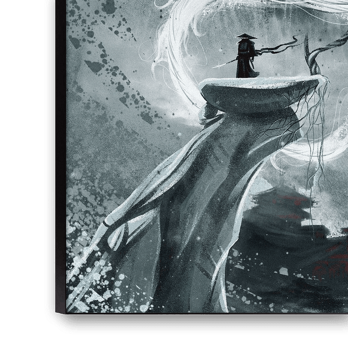 Een eenzame samoerai of ronin staat op een klif onder een enorme rode zon. Witte mystieke rook dwarrelt rond hem en een sierlijke witte draak, met een opvallende rode esdoorn die een vleugje plechtige, mistige elegantie toevoegt.