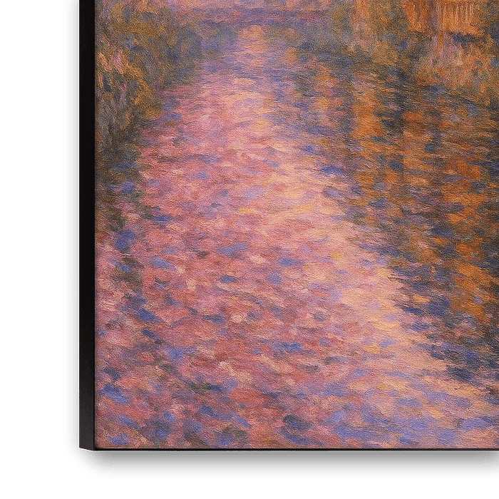 De kunstenaar legt lagen blush, amber en violet in zachte transparantie, waardoor het licht door de verf ademt. De weerspiegelingen glinsteren van beweging - half gezien, half herinnerd - alsof ze door een droom worden bekeken. Elk bloemblaadje, elke rimpeling bestaat slechts een hartslag voordat het weer oplost in het water.
