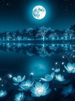 Dit adembenemende digitale kunstwerk vangt een scène van diepe rust en magische schoonheid onder een middernachtblauwe hemel. Een prachtige, volle maan hangt hoog en werpt een briljante, lichtgevende gloed die perfect reflecteert op het stille oppervlak van een kalm meer. Langs de verre oever weerspiegelt een rij bomen met ingewikkelde, gloeiende takken het licht. Hun etherische vormen vormen een spookachtig mooi silhouet tegen de duisternis. Op de voorgrond bloeit een bed van prachtige lotusbloemen, elk bloemblaadje straalt een zacht, koel blauw licht uit, wat bijdraagt aan de buitenaardse sfeer. Het hele werk is weergegeven in een rijk, koel kleurenpalet van diepblauw, groenblauw en helder wit, wat een gevoel van rust, vrede en verwondering oproept. Deze afbeelding is perfect voor iedereen die houdt van fantasielandschappen, vredige nachtscènes of magische natuurkunst.
