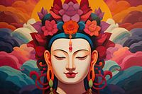 Sereniteit - Het schilderij presenteert een serene, gestileerde portret van een figuur die doet denken aan een Boeddhistische godheid, verrijkt met symbolische bloemmotieven en sieraden, tegen een achtergrond van golvende, harmonische wolken. De stijl is vloeiend en modern met gladde, bijna grafische lijnen, terwijl het kleurenpalet…