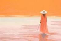 Sereniteit - Op het canvass prijkt een gestileerde figuur in een lang, peach fuzz gekleurd gewaad met een witte hoed, staand in een minimalistisch landschap dat geschilderd is in zachte, warme tinten. De serene uitstraling en het subtiele kleurgebruik geven het werk een kalme, dromerige ambiance, terwijl de brede penseelstreken en abstractie het schilderij een modern tintje geven.