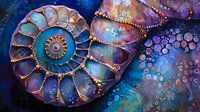 Een serene en harmonieuze spiraal, gouden versiering, zwevend op een rustgevende en vredige achtergrond in blauw en lila.