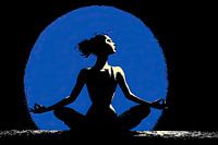 Details: vrouw schilderij, mediterende vrouw, blauw, kunst, yoga, meditatie, rust, energie, welzijn, silhouet
