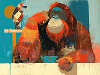 Serenity in Abstract Jungle - Dit dieren schilderij toont een rustende orang-oetan met gesloten ogen en opvallende rode pelsharen, vergezeld door een trendy, geometrisch vormgegeven vogel in harlekijnstijl zittend op een stok.