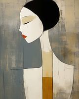 Vrouwelijk profiel, gedistilleerd tot zijn eenvoudigste vorm. Minimalistische abstractie met een sobere kleurenpalet en strakke, sierlijke vormen. Verweerde grijstinten in combinatie met zachte aardetinten en subtiele contrasten tussen de kleurvlakken voegen diepte toe. In een treffende combinatie van modern minimalisme en de tijdloze…