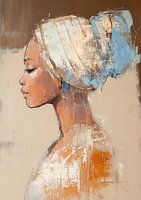 Serenity in Urban Brushstrokes - Dit vrouwen schilderij toont een profiel van een jonge vrouw met een sereen, naar beneden gericht gezicht, gedetailleerd met ruwe, expressieve penseelstreken in aardetinten en de nadruk op een blauw-witte hoofddoek die een contrast vormt met haar huidtint van verweerd oranje en bruin.