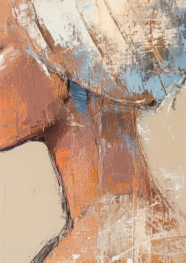 Serenity in Urban Brushstrokes - Dit vrouwen schilderij toont een profiel van een jonge vrouw met een sereen, naar beneden gericht gezicht, gedetailleerd met ruwe, expressieve penseelstreken in aardetinten en de nadruk op een blauw-witte hoofddoek die een contrast vormt met haar huidtint van verweerd oranje en bruin.