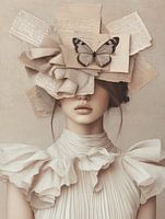 Dit kunstwerk straalt een zachte, poëtische sfeer uit waarin een vrouwelijk portret verweven is met een vlinder en fragmenten van oude documenten. De delicate kleuren en subtiele texturen creëren een gevoel van vergankelijkheid en mysterie. De vlinders symboliseren transformatie en vergankelijkheid, terwijl de verweven fragmenten van brieven en pagina's uit boeken een echo zijn van vervlogen tijden en herinneringen. De expressie van de vrouw is sereen, bijna dromerig, wat het geheel een meditatieve en introspectieve dimensie geeft. Het werk nodigt de kijker uit om stil te staan bij de schoonheid van het moment en de vluchtigheid van het leven.