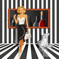 Het opvallende 4-serie van pin-up girls met hond in bijpassende kleur ruimten. Hier de gestreepte in zwart en wit.