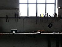 Het gereedschap is neergelegd, de werkbank heeft sporen van arbeid, het raam geeft zicht en licht op het werk.