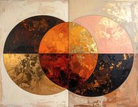 Serie van vier - cirkel vorm in warme kleuren rood bruin goud roze en gebroken wit. Deze abstracte vormen overlappen deels. De stijl van dit werk is heel geschikt voor een warm japandi of landelijk interieur. Het bladgoud geeft het werk een chique look.