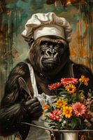 Deze krachtige en intrigerende afbeelding toont een gorilla die met uiterste concentratie in de keuken staat, gekleed in een koksmuts en schort, terwijl hij een garde vasthoudt en bloemen in een pan presenteert. Het contrast tussen de robuuste uitstraling van de gorilla en de delicate bloemen zorgt voor een fascinerende combinatie van kracht en zachtheid. De rijke details van het portret en de speelse interpretatie maken dit werk een opvallende keuze voor liefhebbers van eigenzinnige en artistieke decoraties.