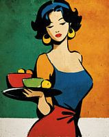 Details: vrouw, dienblad, fruit, kleur, pop-art, groen, rood, geel, vrouwenschilderij, keuken