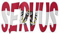 Digital composition. The word Servus with Austrian flag overlay. Servus is used as a greeting in many countries. Österreich, Austria