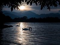 Een setje zwanen, gefotografeerd in een bergachtige omgeving. Prachtige sfeerplaat die het ook mooi doet als behang.