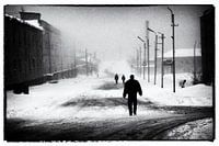Sevan Armenia A figure walks through the winters snow, film noire effect. Analogue photo