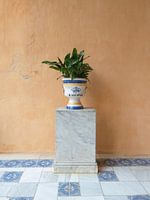 Ontdek een sereen moment uit het iconische Real Alcázar in Sevilla: een eenvoudige keramische plantenbak gevuld met weelderig groen, rustend op een marmeren sokkel tegen een warme terracotta muur. Aangevuld met klassieke blauw-witte tegels eronder, combineert dit minimale maar elegante kunstwerk mediterrane architectuur, ontspannen boho charme en een tijdloze inrichting. Ideaal voor wie houdt van reisgeïnspireerde interieurs, architecturale details en rustige, natuurlijke ruimtes.