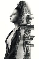 Deze dubbel belichte foto creëert een boeiende en speelse compositie, waarbij de contouren van de stad samenvloeien met de gracieuze vormen van de vrouw. Het contrast tussen de stoere architectuur van de stad en de zachte sensualiteit van het vrouwelijke figuur zorgt voor een intrigerend samenspel van elementen.