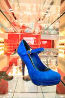 Sexy vrouwelijke blauwe schoen met hoge hak in de vitrine van glas van een schoenenwinkel. Shoe porn. Mode, kleding, vintage