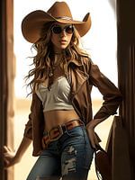 In deze verleidelijke scène staat een sexy blonde vrouw met een cowboy-achtige uitstraling, een perfecte samensmelting van elegantie en sensualiteit. Haar golvende blonde lokken vallen losjes over haar schouders, en ze draagt een stijlvolle cowboyhoed die haar mysterieus omlijst. De zonnebril geeft haar een ondoorgrondelijke…