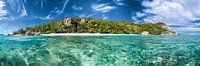 Uitzicht op het eiland La Digue in de Indische Oceaan met turquoise zee, palmbomen en wit strand.