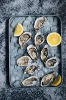 Verse oesters met citroenen op ijs, ijs, verse oesters, lekker eten, citroenen, grijze achtergrond, food art, vis, zee eten, weekdier, voedsel collectie, schaaldieren