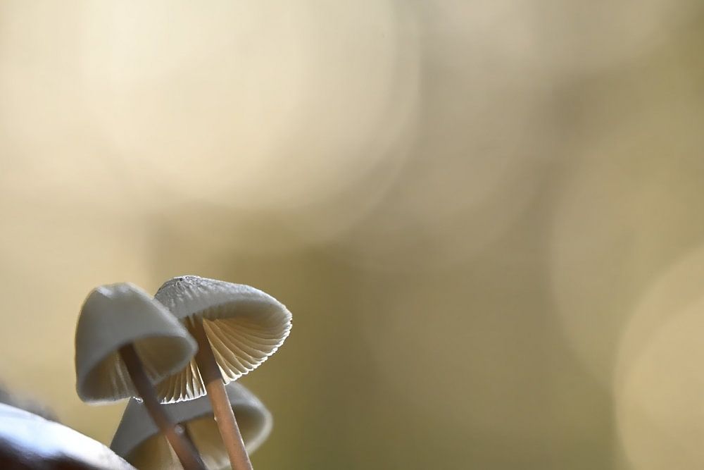 Een dromerig beeld van paddenstoelen met tegenlicht.