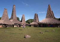 Een jongen loopt op het veld net buiten het traditionele dorp Ratenggaro in West Sumba, Indonesie. De hoogte van een dak geeft de status aan van de eigenaar van het huis.