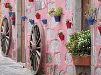 Dit sfeerbeeld van een roze muurtje met gekleurde planten en karrewielen van hout kwam ik tegen op Gran Canaria. Ik besloot het vast te leggen, omdat ik hou van dit soort tafereeltjes in het buitenland. Het maakt de straten zo gezellig en sfeervol.