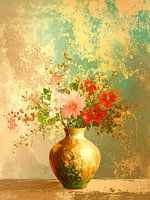 Dit schilderij ademt een sfeer van tijdloze elegantie en warme, zachte luxe. De gouden vaas en de glinsterende, getextureerde achtergrond, verrijkt met groen-blauwe tinten, creëren een lichte, rijke gloed.