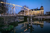 Het beeld is geschoten met lange sluitertijd, waardoor ook het licht van een bewegende auto (over de brug) is opgenomen.