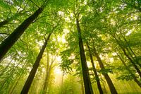 Uitzicht naar boven in een sfeervol bos met groene bladeren aan de bomen in de herfst met een mist in de lucht. De mist geeft het bos een magische sfeer met de bladeren die net van kleur gaan veranderen tijdens deze vroege herfstdag in het Kloosterbos in Gelderland.