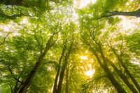 Uitzicht naar boven in een sfeervol bos met groene bladeren aan de bomen in de herfst met een mist in de lucht. De mist geeft het bos een magische sfeer met de bladeren die net van kleur gaan veranderen tijdens deze vroege herfstdag in het Kloosterbos in Gelderland.