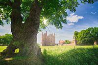 Sfeervol en kleurrijk landschap met Kasteel Doornenburg op een zonnige dag met de beroemde Duizendjarige zomereik op de voorgrond. Kasteel Doornenburg is een van de grootste kastelen van Nederland en open voor publiek.